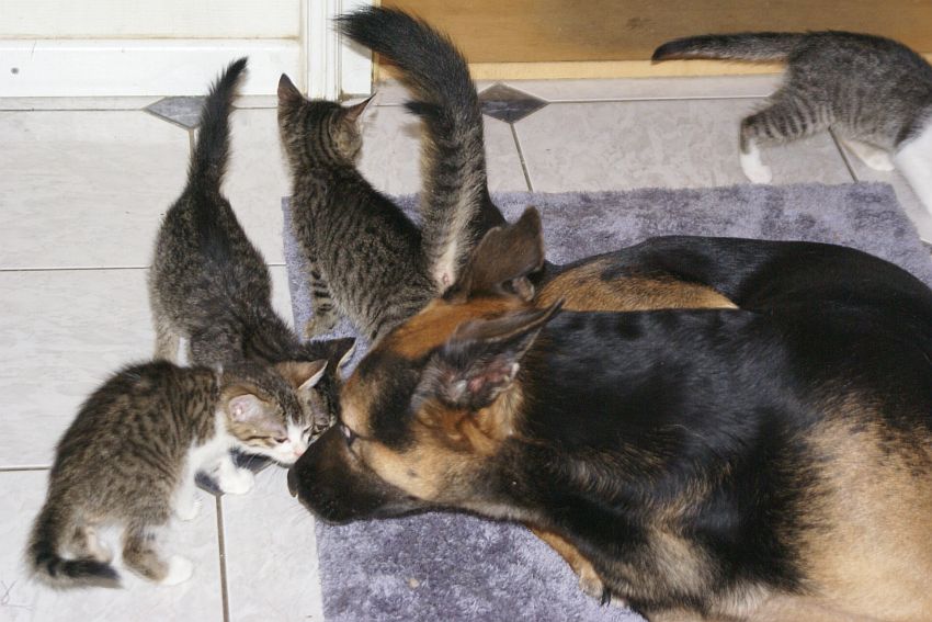 Die frechen Früchten sind ausgebrochen und haben den Flur der Pflegestelle in Beschlag genommen. Mittendrin lag allerdings etwas ziemlich Großes, ganzkörperbehaart und außeririsch riechend. Gaia, die dreibeinige THV-Schäferhündin war dem “Überraschungsangriff” der Minis ausgeliefert und beide Seiten beschnüffelten sich vooooorsichtig und von oben bis unten. Alles verlief sehr friedlich und sicher werden die Früchtchen heute nacht gut schlafen und von einer außerirdischen Lebensform träumen!