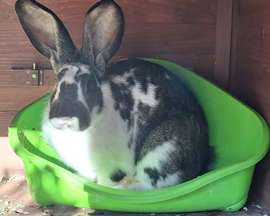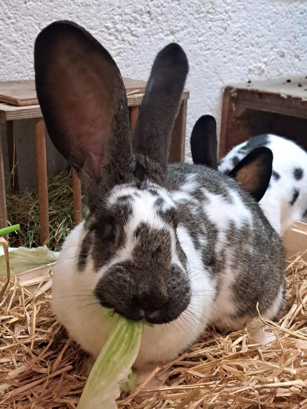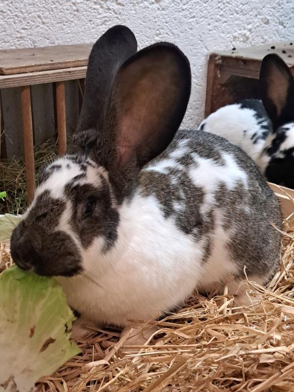 Melli kam zusammen mit 4 weiteren Mädels aus einem Notfall zu uns: ein Vermehrer hatte viele Großkaninchen, erkrankte und konnte sich nicht mehr um die Tiere kümmern. So wurde die Zucht aufgelöst und die Tiere sollten geschlachtet werden, falls sich nicht umgehend jemand findet, der sie übernimmt. Wir konnten hier Hilfe zusagen und so konnten 5 Kaninchendamen bei uns einziehen.